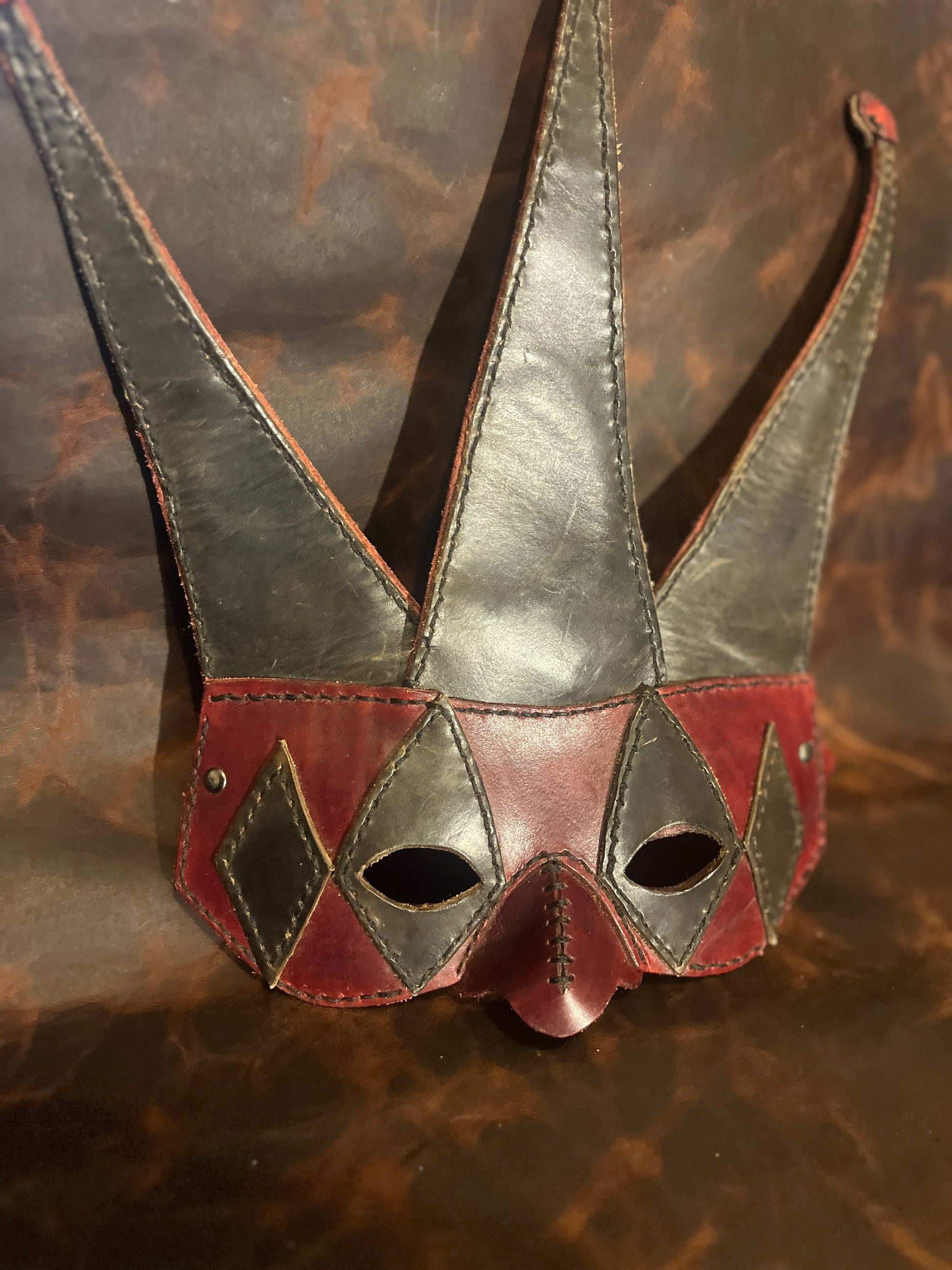 Handcrafted Leather Jester Mask - Red and Black Adjustable Mask for Cosplay, LARP, or Display